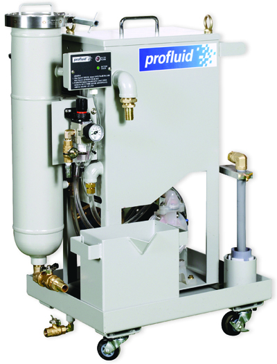 PROFLUID Oljeseparatör Äldre metoder som använder sig av t.ex. ett band/film som roterar genom oljan och lyfter med sig smuts och olja, lyfter även med kylmedel. Den metoden är inte särskilt effektiv eller ren. Profluids oljeseparatör använder sig av vätskornas unika egenskaper för att separera dem. Olika vätskor har olika partikelstorlekar och beter sig olika när de pumpas snabbt genom filter. Separatören kan enkelt flyttas från maskin till maskin, ingen modifikation behövs. Sänk helt enkelt ner pumpen i kylmedelstanken. |