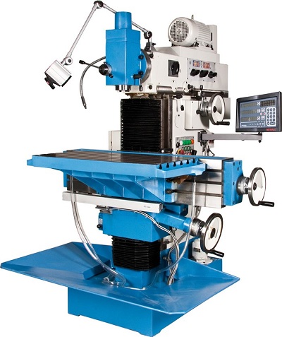| Kompakt industriell fräsmaskin. Borttagbart huvud för konvertering till en horisontell maskin. Bordet kan skruvas bort. Huvudet är utrustat med en borrpinol samt är vridbart till vänster/höger. Trots sin storlek är maskinen mycket stabil. | ![]() |