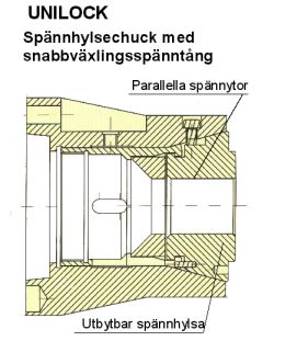 Unilock, spännhylsechuckar och spännhylsor i snabbväxlingsutförande. Framför allt i flerspindliga maskiner tar byte av spännhylsor lång tid, men med Unilocks system sker bytet mycket snabbt. Hylsorna kan enkelt bytas med hjälp av en tryckluftsdriven apparat, som klämmor ihop hylsorna, så att de lätt kan dras ut och nya hylsor sätts i på motsvarande sätt. Denna apparat kan manövreras för hand, men kan också monteras på t.ex. en robot för automatisk hantering. Hylsorna kan även bytas manuellt med hjälp av ett enkelt verktyg.Till flerspindelautomater finns också matartänger, tillverkade som hylsor med fyllning av polyuretan, som är borrad för olika diametrar. Ev vibrationer elimineras helt med dessa hylsor. Finns för de flesta fabrikat liksom påskjutarhylsor för de flesta stångmagasin.